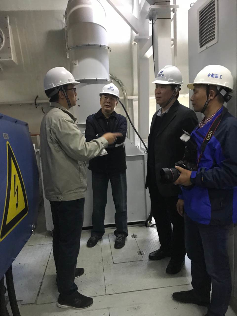 赵小平、曹培玺等一行进入5MW风电机组机舱视察,听取了中国海装相关负责人对公司发展历程、全产业链、5MW机组配套情况及售后运维等方面的汇报。对中国海装完全具有自主知识产权的5MW海上风电机组表示了充分肯定,尤其对全球最大风轮直径的H171-5MW型机组在行业内的引领作用称赞有加。