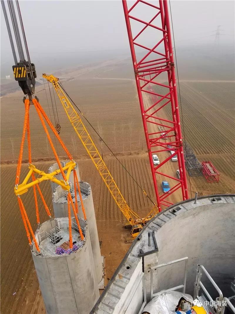 3月22日下午2时,中国海装首台120米轮毂高度钢混塔筒在内黄成功吊装,望着这台高大的机组耸立在蓝天白云下,项目团队的每个人像看着自己的孩子一样,高兴之情溢于言表。