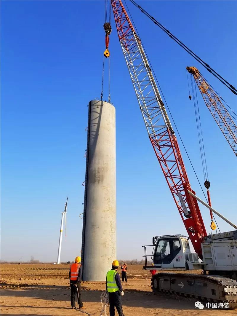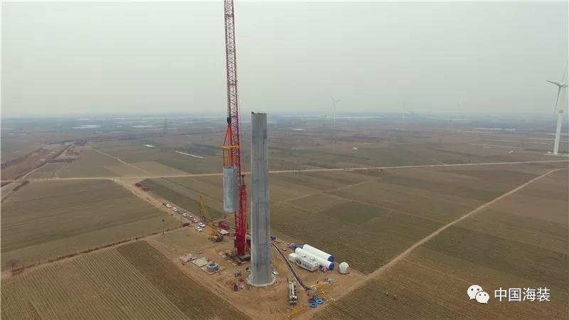 在分析传统全钢塔架在增高时会面临塔壁厚度、运输高度及重量、制造成本等方面存在着弊端之后,中国海装选择了钢混塔筒(混凝土+钢制)技术方案,这一方案兼具了安全性和经济性。